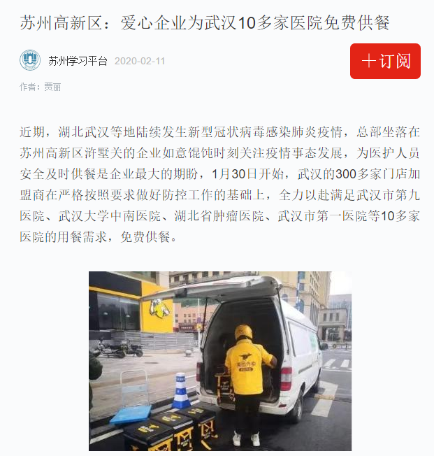 学习强国报道:苏州高新区:爱心企业为武汉10多家医院免费供餐