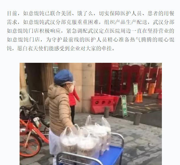 目前,如意馄饨已联合美团、饿了么,切实保障医护人员、患者的用餐需求,如意馄饨武汉分部克服重重困难,组织产品生产配送,武汉分部如意馄饨门店积极响应,紧急调配武汉定点医院周边一直在坚持营业的如意馄饨门店,为守护最前线的医护人员精心准备热气腾腾的暖心馄饨,愿白衣天使们能感受到企业对大家的牵挂。