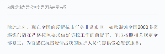 除此之外,现在全国的疫情抗击任务非常艰巨,如意馄饨全国2000多家连锁门店在严格按照要求做好防控工作的前提下,争取按照相关规定全部复工,为奋战在抗击疫情战线的医护人员们提供爱心餐饮服务。