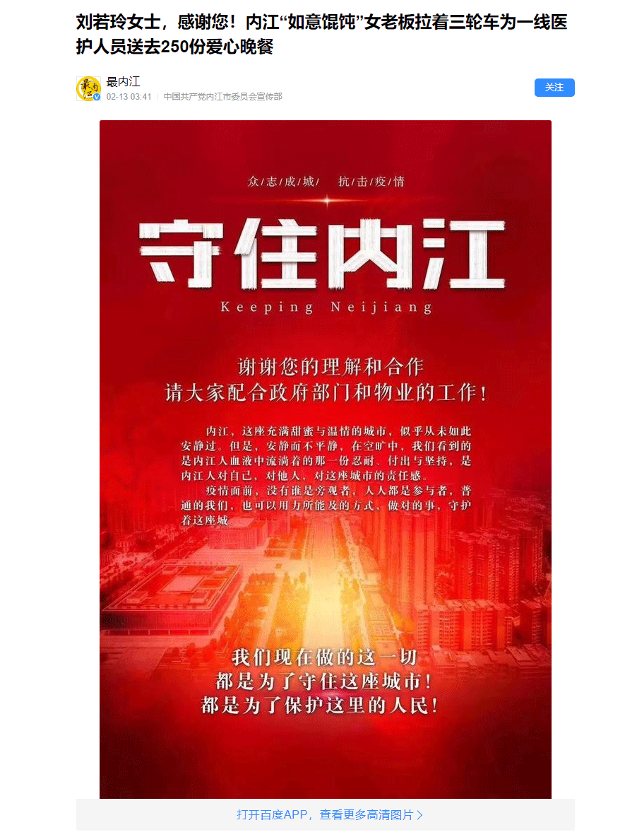 中国共产党内江市委员会宣传部:刘若玲女士,感谢您!内江“如意馄饨”女老板拉着三轮车为一线医护人员送去250份爱心晚餐