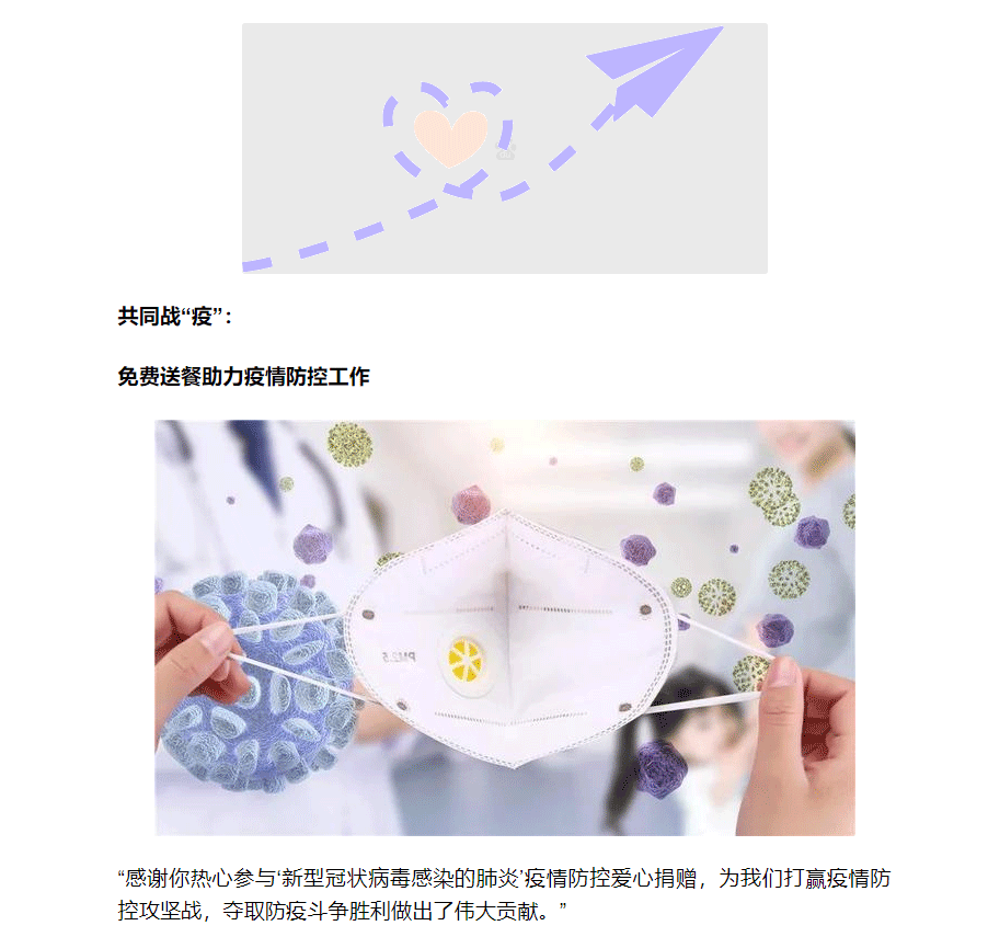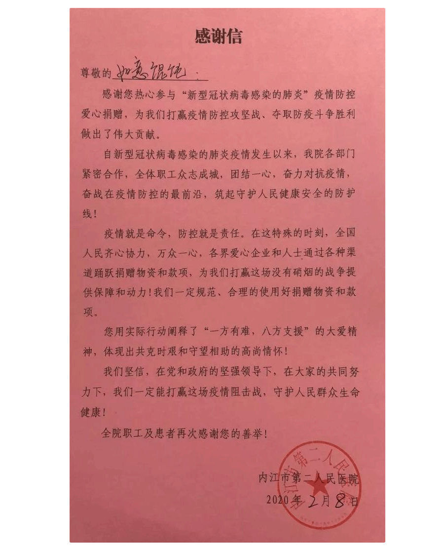 “感谢你热心参与‘新型冠状病毒感染的肺炎’疫情防控爱心捐赠,为我们打赢疫情防控攻坚战,夺取防疫斗争胜利做出了伟大贡献。”