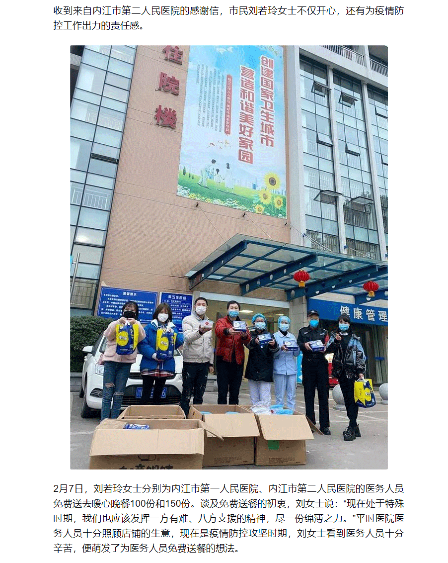 2月7日,刘若玲女士分别为内江市第一人民医院、内江市第二人民医院的医务人员免费送去暖心晚餐100份和150份。谈及免费送餐的初衷,刘女士说:“现在处于特殊时期,我们也应该发挥一方有难、八方支援的精神,尽一份绵薄之力。”平时医院医务人员十分照顾店铺的生意,现在是疫情防控攻坚时期,刘女士看到医务人员十分辛苦,便萌发了为医务人员免费送餐的想法。