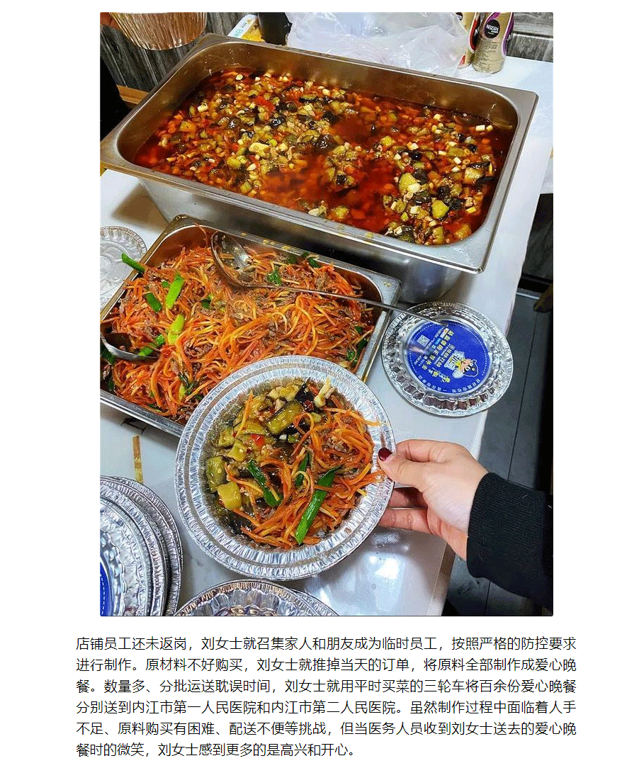 店铺员工还未返岗,刘女士就召集家人和朋友成为临时员工,按照严格的防控要求进行制作。原材料不好购买,刘女士就推掉当天的订单,将原料全部制作成爱心晚餐。数量多、分批运送耽误时间,刘女士就用平时买菜的三轮车将百余份爱心晚餐分别送到内江市第一人民医院和内江市第二人民医院。虽然制作过程中面临着人手不足、原料购买有困难、配送不便等挑战,但当医务人员收到刘女士送去的爱心晚餐时的微笑,刘女士感到更多的是高兴和开心。