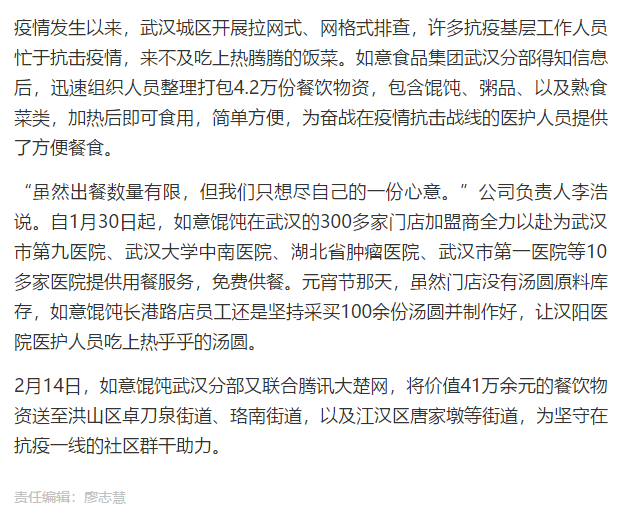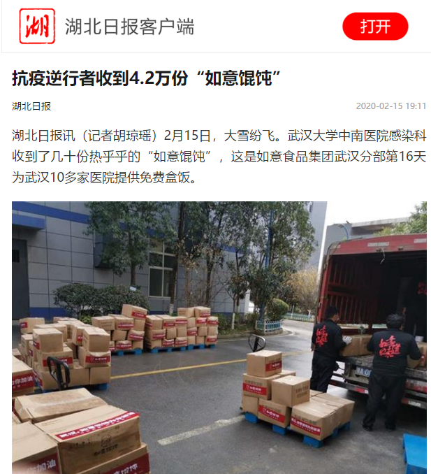 湖北日报报道:抗疫逆行者收到4.2万份“如意馄饨”